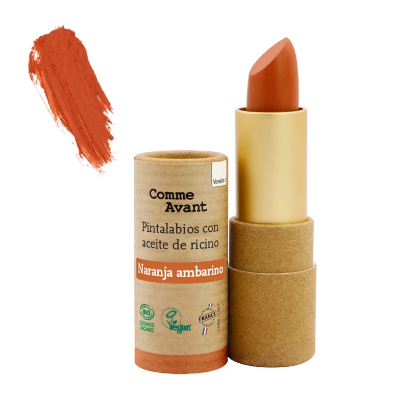 Composición corta: manteca de murumuru, cera de candelilla, pigmento mineral, emoliente presente en el pigmento, aceite de ricino, agente filmógeno de origen vegetal.